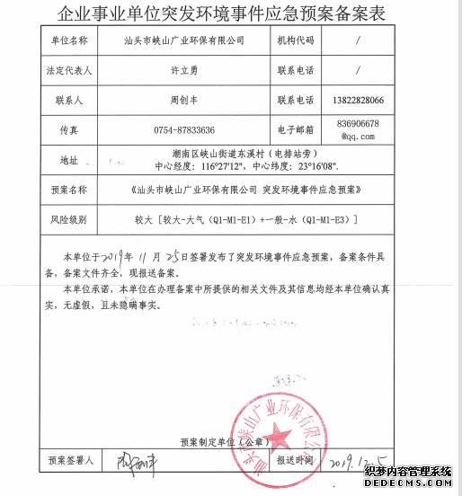 1、單位名稱: 汕頭市峽山廣業(yè)環(huán)保有限公司